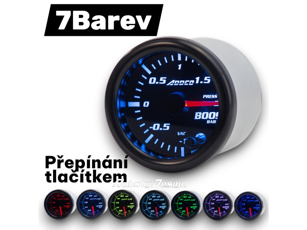 ADDCO přídavné budíky s nastavitelným led podsvícení (7-barev). Ukazatel tlaku turba v rozsahu 1 - 2 BAR.