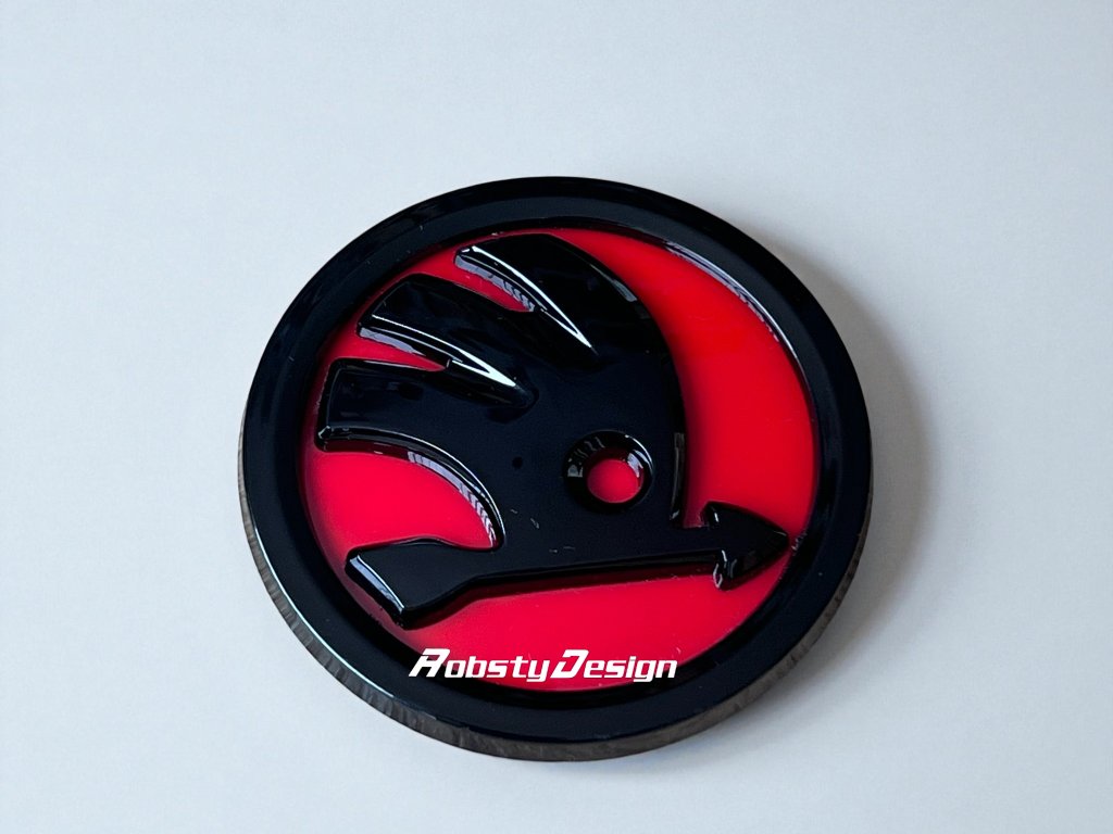 Emblém Škoda velikosti 80-90mm v barvě červeno-černá, určený k nalepení na přední část vozu (maska) a na zadní část vozu (kufr) pomocí oboustranné lepící pásky.